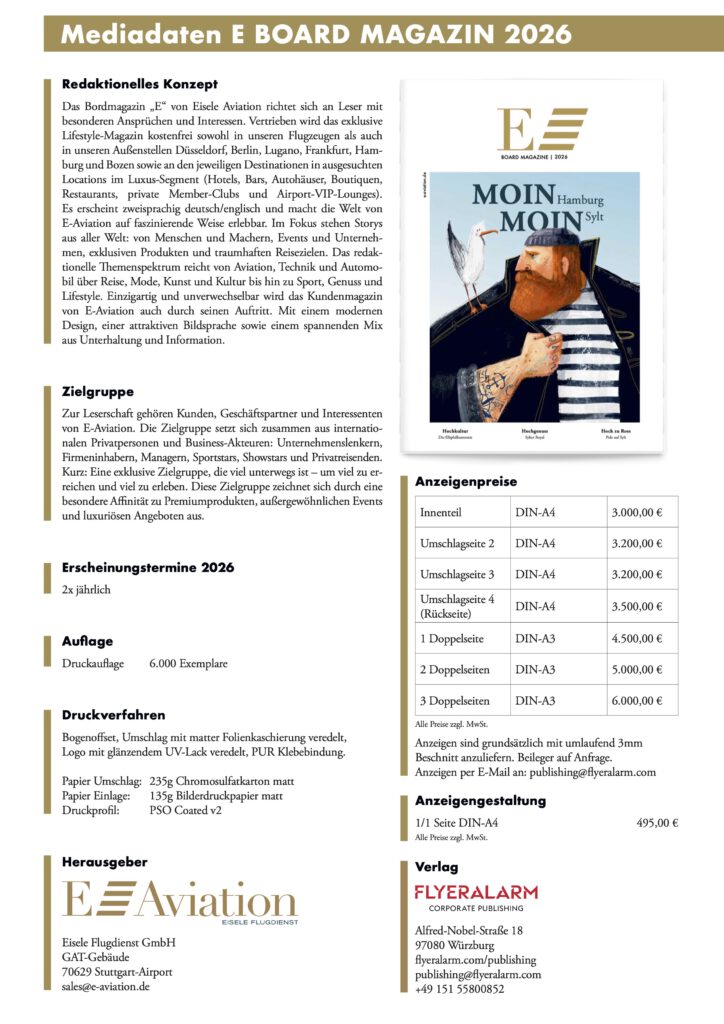 Das Bordmagazin „E“ von Eisele Aviation richtet sich an Leser mit besonderen Ansprüchen und Interessen. Vertrieben wird das exklusive Lifestyle-Magazin kostenfrei sowohl in unseren Flugzeugen als auch in unseren Außenstellen Düsseldorf, Berlin, Frankfurt, Hamburg, Lugano und Bozen. sowie an den jeweiligen Destinationen in ausgesuchten Locations im Luxus-Segment (Hotels, Bars, Autohäuser, Boutiquen, Restaurants, private Member-Clubs und Airport-VIP-Lounges). Es erscheint zweisprachig deutsch/englisch und macht die Welt von E-Aviation auf faszinierende Weise erlebbar. Im Fokus stehen Storys aus aller Welt: von Menschen und Machern, Events und Unternehmen, exklusiven Produkten und traumhaften Reisezielen. Das redaktionelle Themenspektrum reicht von Aviation, Technik und Automobil über Reise, Mode, Kunst und Kultur bis hin zu Sport, Genuss und Lifestyle. Einzigartig und unverwechselbar wird das Kundenmagazin von E-Aviation auch durch seinen Auftritt. Mit einem modernen Design, einer attraktiven Bildsprache sowie einem spannenden Mix aus Unterhaltung und Information.